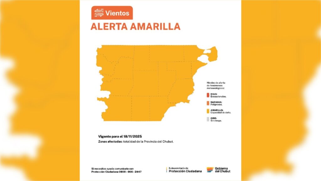 La subsecretaría de Protección Ciudadana del Chubut, informó de la vigencia del alerta amarilla por vientos.